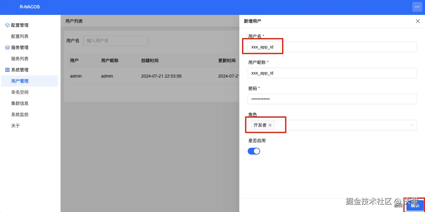 - 在r-nacos控制台录入应用依赖的用户信息,完成用户数据初始化。