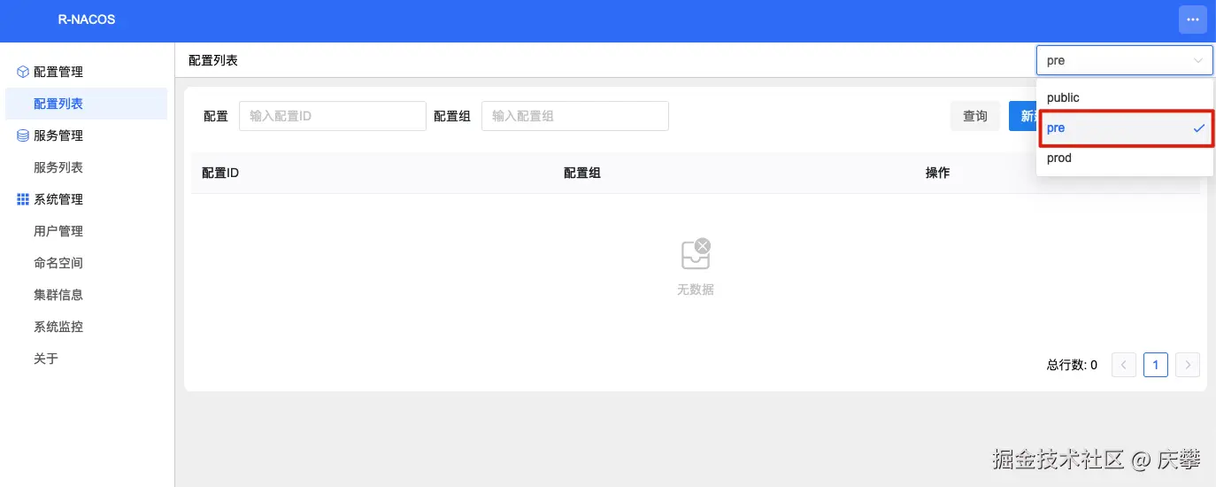a) 进入r-nacos控制台->配置列表页,选择对应命名空间