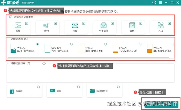 数据 蛙恢复专家是一款功能强大的电脑数据恢复软件,能够支持大部分文件类型的扫描与恢复,精准、快速地定位用户需求的目标文件,页面简洁清晰,功能简单却有效,非常适合零经验的电脑小白使用。而且该软件还推出免费试用版本,其涵盖的功能和正式版区别不大,用户可以用试用版,体验其功能,再决定是否长期使用。下面是软件的使用流程,简单易懂,只需几步就能做到电脑数据恢复。具体步骤请看下面: