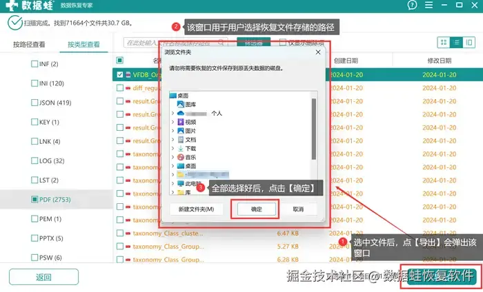 步骤4: 找好要恢复的文件数据后,单击进行勾选,最后点击右下方的【导出】,会弹出【浏览文件夹】的页面,在这里需要用户选择恢复好的文件数据储存的位置,注意不要将恢复好的文件放在原来丢失的位置。