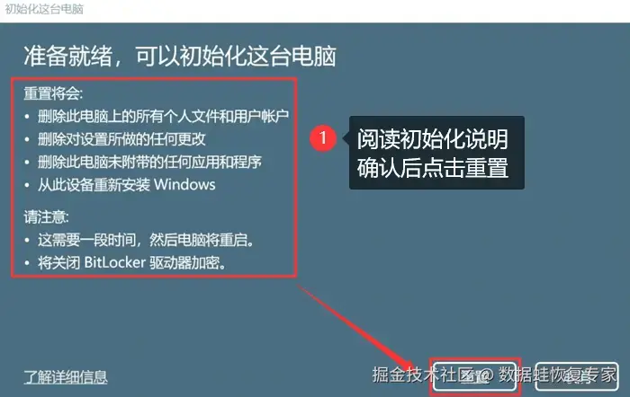 第四步:准备就绪,阅读初始化说明后,点击 【重置】 后,电脑系统一键重装,开启恢复出厂设置。