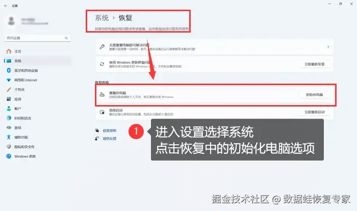 第一步:进入电脑设置,点击 【系统】-【恢复】-【重置此电脑】 。