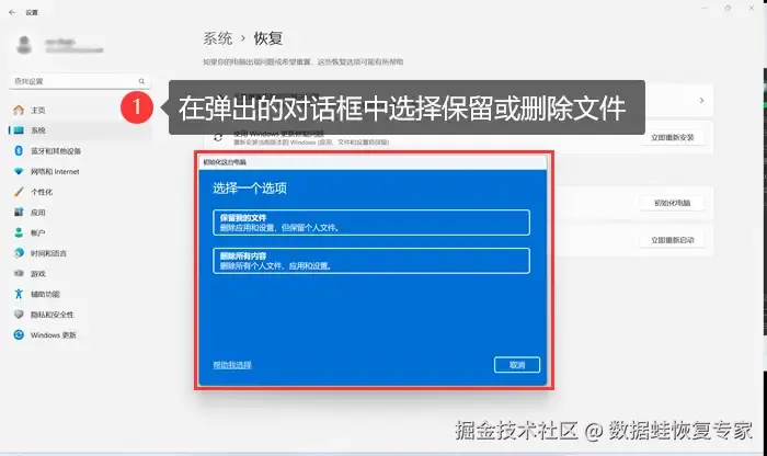 第二步:在弹出的对话框中,你可以选择 【保留我的文件】或【删除所有内容】 ,然后再进行下一步。