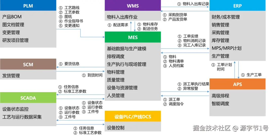 MES 和 ERP/SCADA: MES 直接与生产线操作相关,它桥接了 ERP 系统和生产过程,提供车间层面的实时数据给 ERP 系统,同时从 SCADA 系统收集设备和过程数据,以优化生产执行。