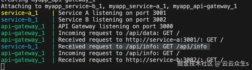 最后,运行 docker-compose up --build 命令以构建两个服务和 API 网关的镜像,并以容器形式启动它们。