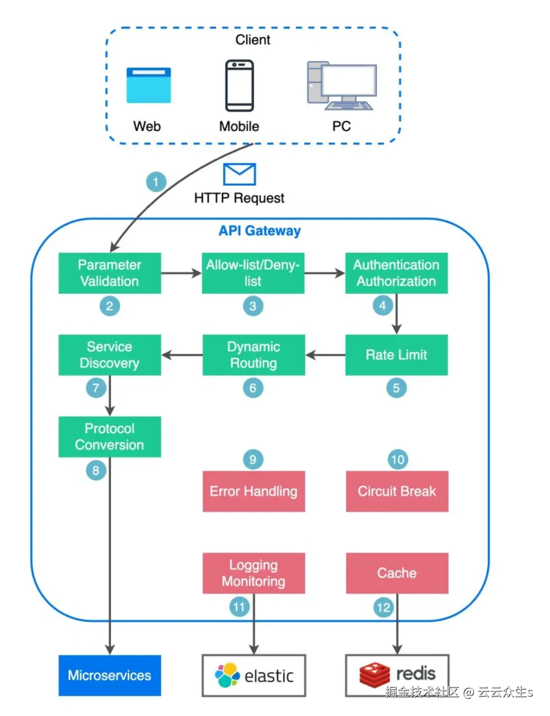 API 网关协调流量流,聚合来自多个微服务的响应,并处理协议转换以实现标准化通信。它实施安全措施,包括身份验证和授权,并包含负载均衡、缓存和日志记录等功能。