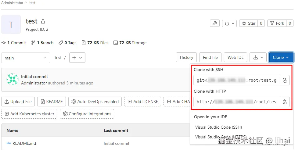 - 返回项目首页,单击 clone 记录项目地址。如下图所示: