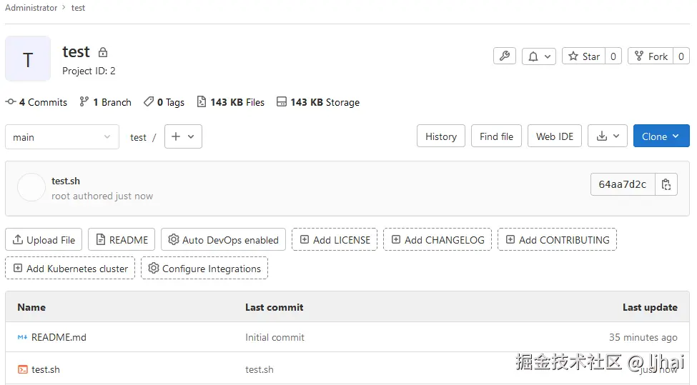 - 执行以下命令,将 test.sh 同步至 GitLab 服务器。