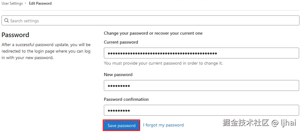 3.2 在 User Settings 页面中,选择左侧导航栏的 Password。