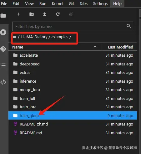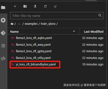 在左侧的文件列表,Llama-Factory的文件夹里,打开examples\train_qlora(注意不是 train_lora)下提供的llama3_lora_sft_awq.yaml,复制一份并重命名为yi_lora_sft_bitsandbytes.yaml。