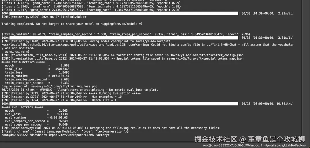 运行过程大概需要10分钟,当你看到下面这个界面的时候,微调过程就结束了。
