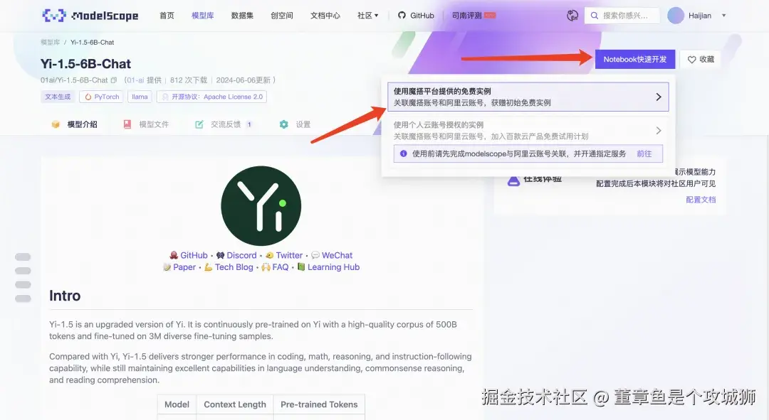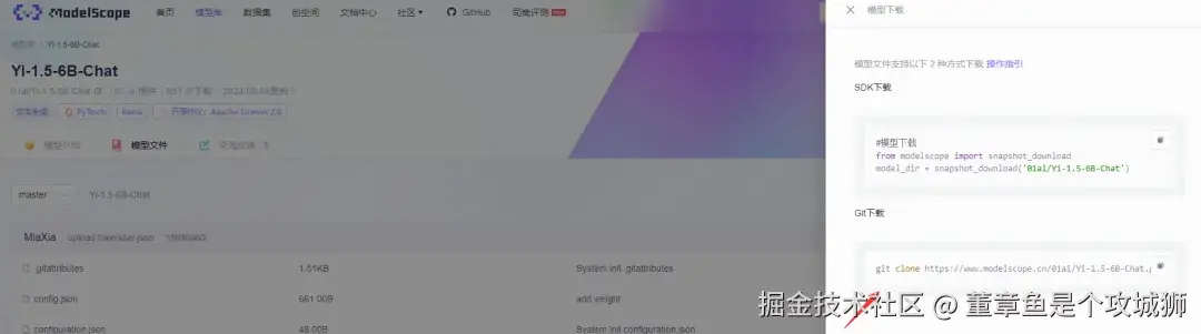 零一万物的 Yi 开源大语言模型的权重可以在HuggingFace和ModelScope上找到,这里我选择从ModelScope上下载。