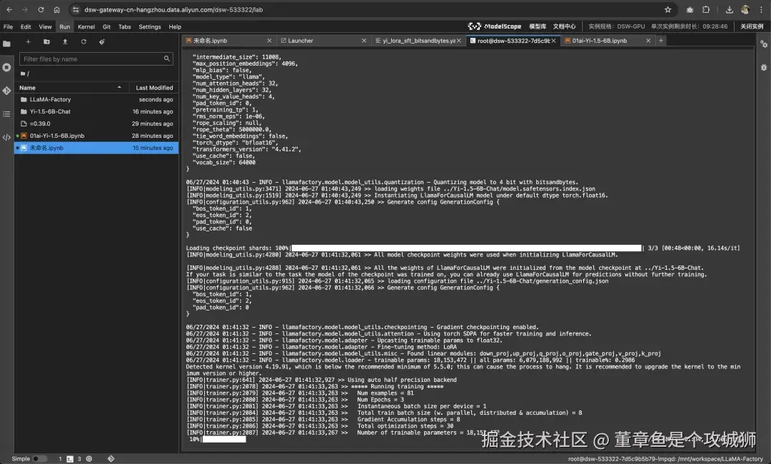 保存刚才对于 yi_lora_sft_bitsandbytes.yaml 文件的更改,回到终端terminal。