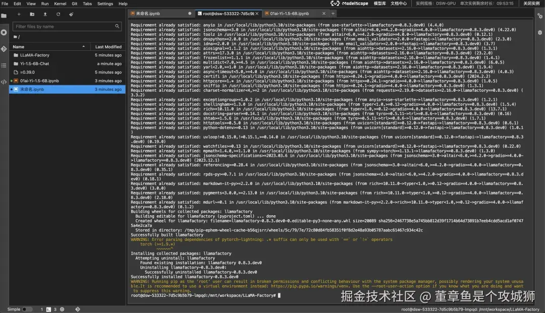 # ⚠️下面两行命令在刚启动的Terminal中执行⚠️cd LLaMA-Factorypip3 install -e ".[torch,metrics]"