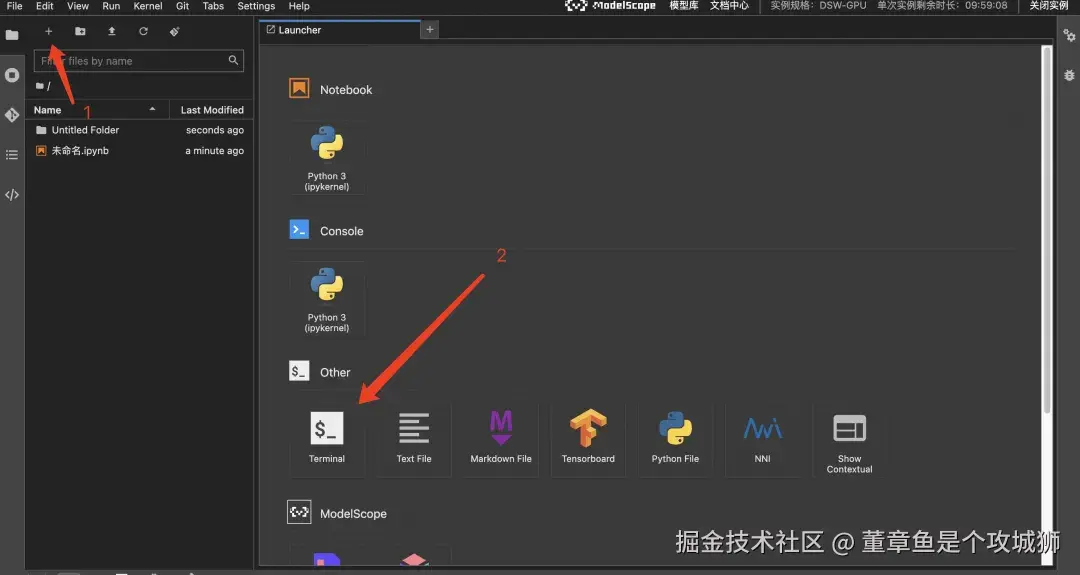 魔塔社区内置了JupyterLab的功能,你进入之后,可以找到 Notebook 标签,新建一个Notebook(当然你在terminal 里执行也没问题)。