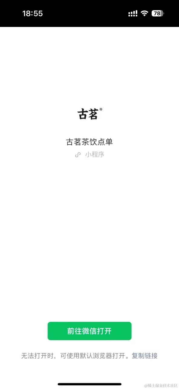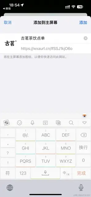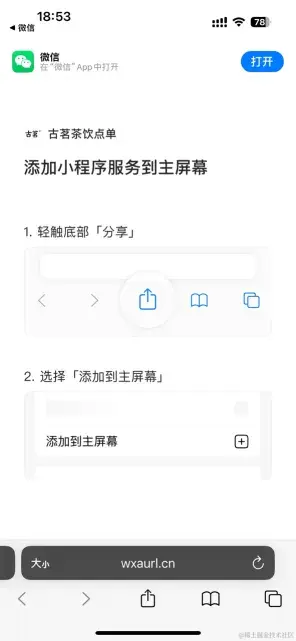以上是微信小程序添加到桌面的用户最短路径,但是如果第二步里用户没有按照操作指引去生成快捷方式,而再次使用Safari打开短链会是怎样呢?试一下吧。