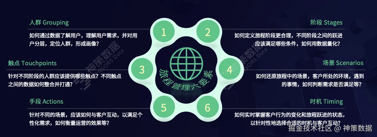 当前,保险企业在私域客户旅程管理的过程中,面临重重挑战,主要表现在人群、阶段、触点、场景、手段和时机六个方面,如下图所示:
