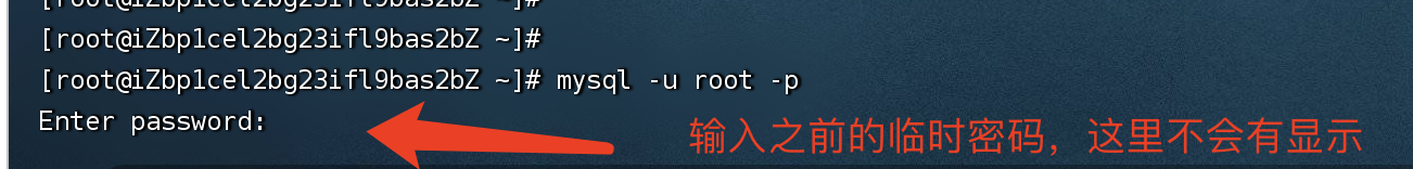 注意:输入密码时,Enter password 后面不会有任何显示,此时实际是输入成功的,输入完密码后直接回车即可。或使用:mysql -u root -p 密码 ,回车后,即可直接进入数据库