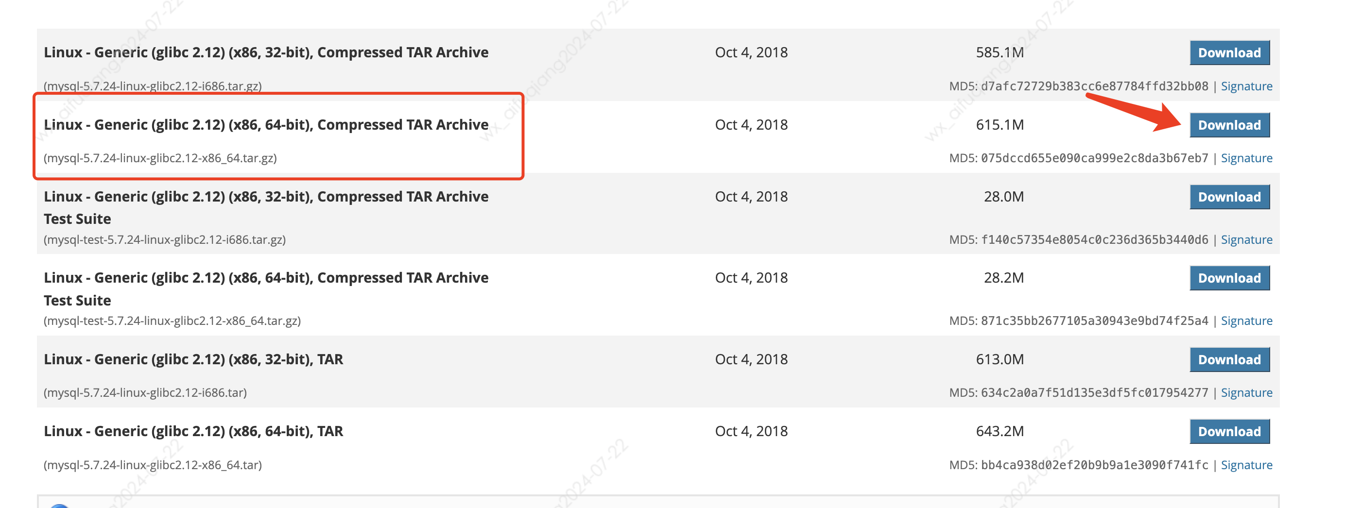 1.可以去官方网站链接: downloads.mysql.com/archives/co… ,下载mysql-5.7.24-linux-glibc2.12-x86_64.tar压缩包。
