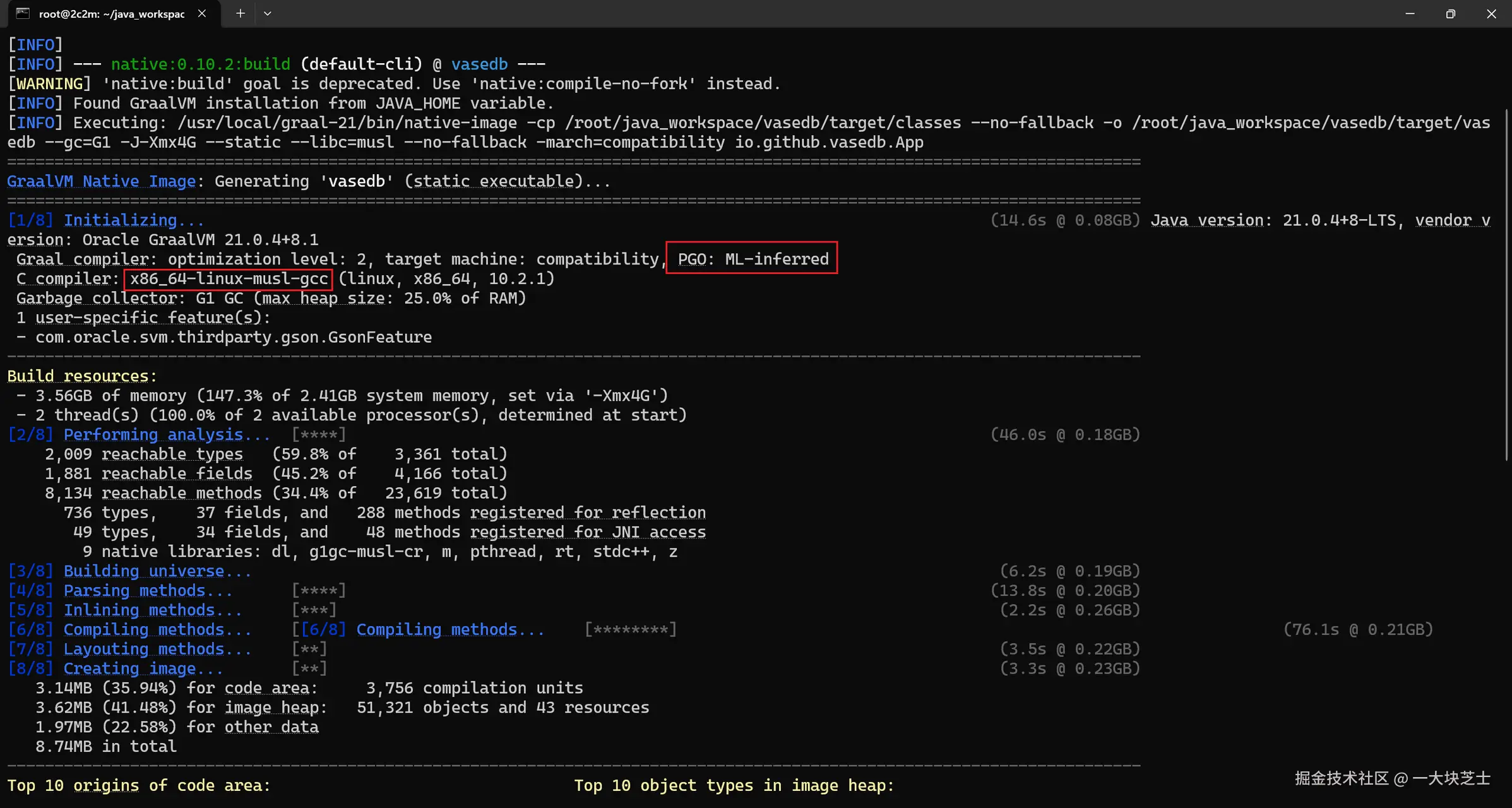 从编译日志输出可以看到,AOT 编译器启用了 PGO: ML-inferred 优化,这个默认在其他平台是不会启动的,只要在 Linux 平台下使用 x86_64-linux-musl-gcc 才会开启的,