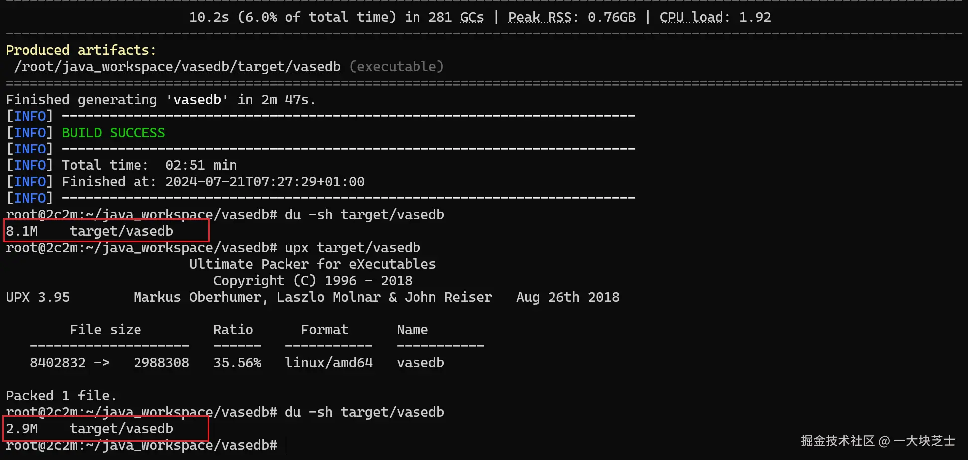 默认情况下,GraalVM 的 AOT 编译在链接时通常使用系统的标准 glibc 库,但在小型嵌入式设备或对内存要求极低的环境中,glibc 并未针对这些场景做出特别优化。相比之下目前有另外一种专有的 musl 标准库实现,musl 被开发出来就是专注在内存受限的设备上表现优异,使用 musl 生产的二进制文件通常比使用 glibc 生产的文件体积更小,所以更推荐直接使用 musl 替代 glibc 去做编译链接优化。