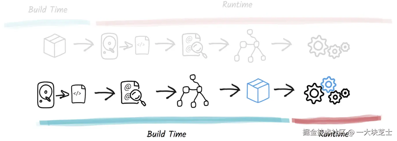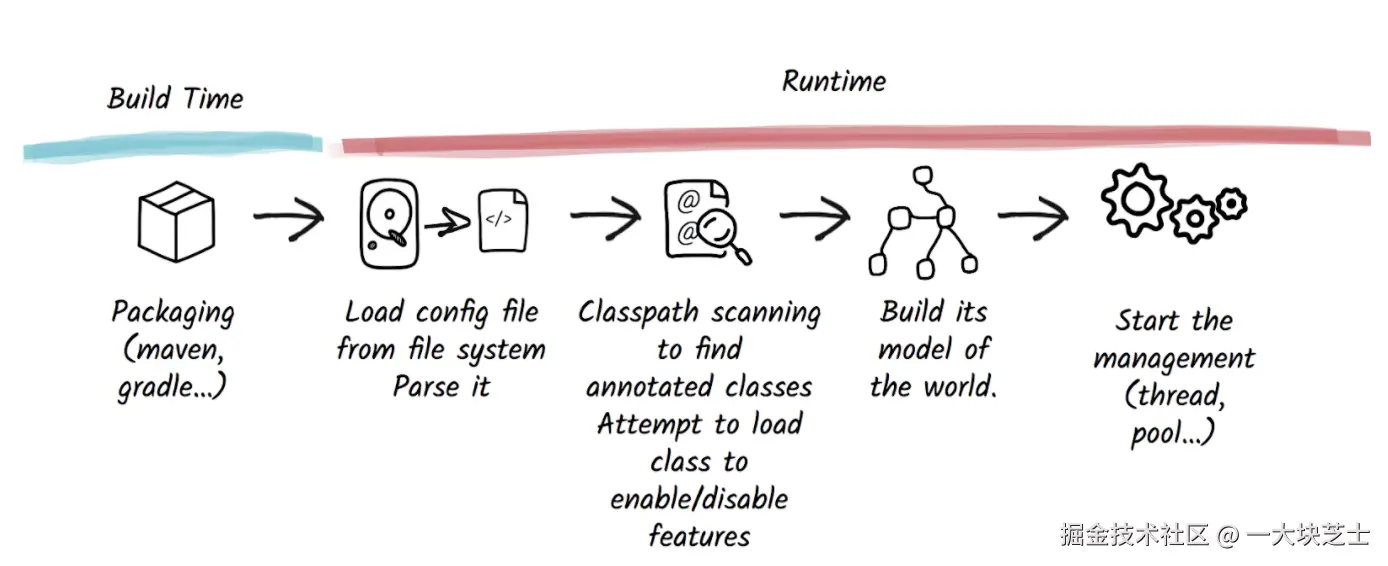 如上图,在 AOT 模式下将在运行时的过程放到在程序构建阶段,构建阶段会对 Java 程序执行静态代码分析和依赖可达性分析,将其所有的依赖软件包都编译生产所属平台对应的可执行二进制文件。
