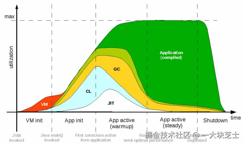 下图为传统的 Java 运行时执行程序的生命周期,首先应用的开发者将 *.java 源代码编译为 bytecode 和 jar 依赖包通过 maven 构建打包为一个单独的 jar 包。当执行 java -jar xxx.jar 命令时,首先要启动 JRE 中的 JVM 程序,因为 JVM 本身也是一款单独程序对应着 $JAVA_HOME\bin 目录中的 java ,当 JVM 启动之后会在系统中创建一个进程,将要运行的 jar 程序包和 JRE 标准库中 class 文件加载入 JVM 内存中,并且找到 main 方法开始解释执行。当程序运行一段时间之后 JVM 充分获取了 Java 程序的一些执行数据信息,开始对程序进行 JIT 及时编译优化程序,当程序被 JIT 优化之后的程序才能达到和 C/C++ 这种直接编译为 Native Code 程序的性能。