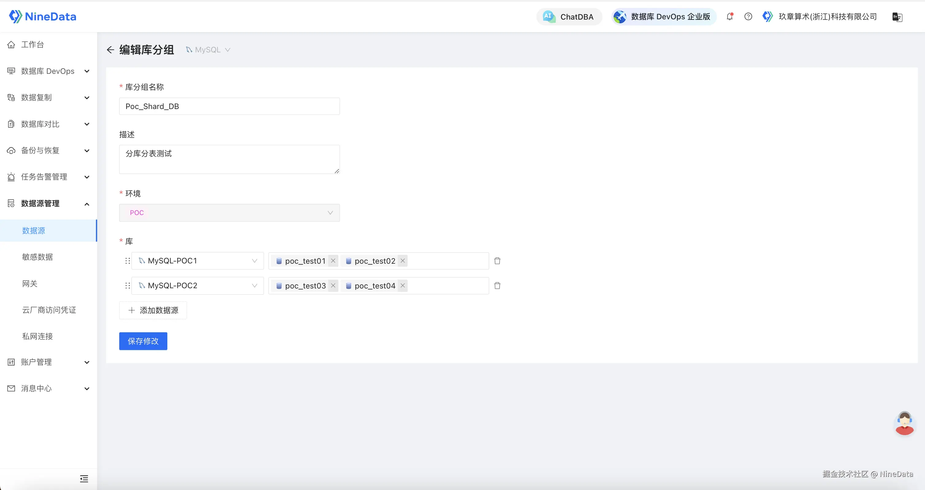 在 NineData 的数据库 DevOps 专业版以上版本中,支持库分组的创建,可以将不同数据源中的库添加到该库分组中,用来进行统一的变更与查询。