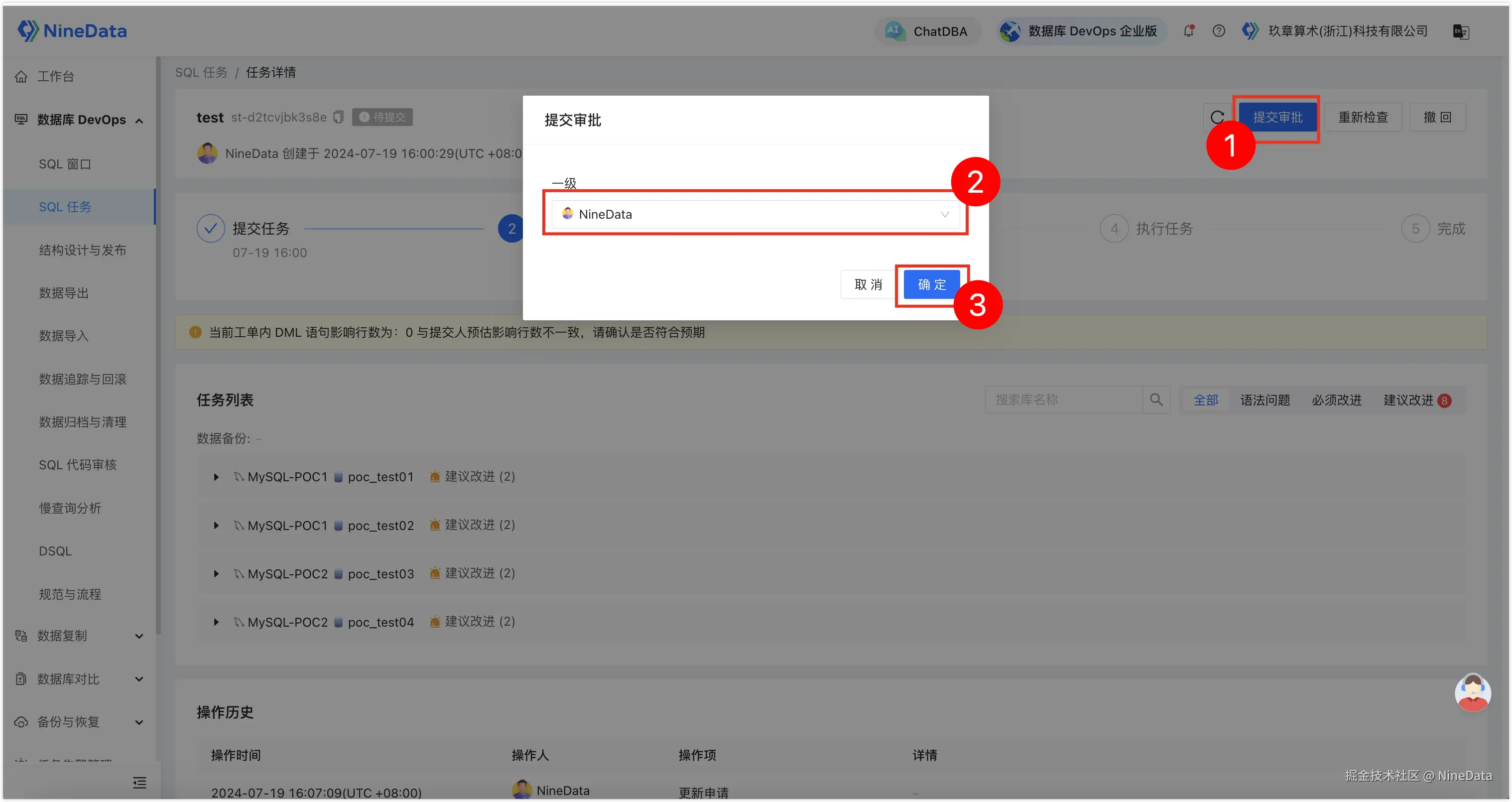 通过 NineData 的 SQL 任务功能,对库分组发起变更申请,经过系统(规范预审)和审批人员的双重审批后,DDL 语句将会在库分组中的所有分库中执行。