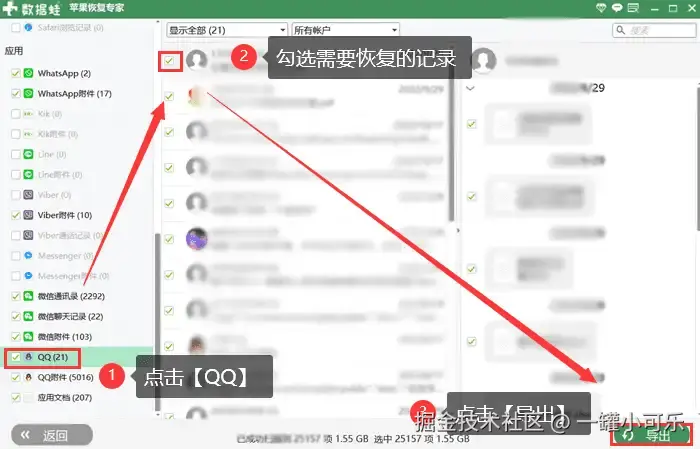 步骤3:扫描成功后,在导航栏找到 【QQ】 软件的图标,点击进入就可以预览备份的聊天记录,勾选需要恢复的聊天记录,点击 【导出】 即可恢复。