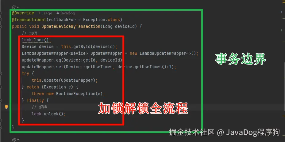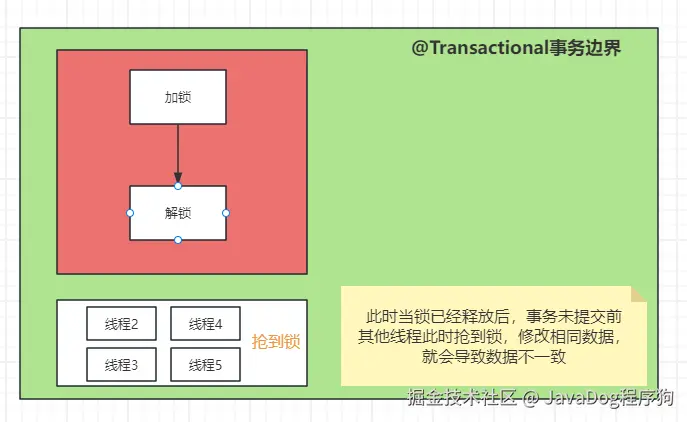 使用@Transactional 注解来管理事务,但锁的获取和释放并没有放在事务边界之内。这意味着如果在事务提交之前锁就被释放了,其他线程可能在当前事务结束之前修改相同的数据,这会导致数据不一致。