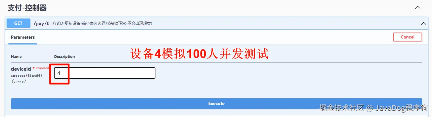@Operation(summary = "方式D-更新设备-缩小事务便捷方法(锁正常-不会出现超卖)")