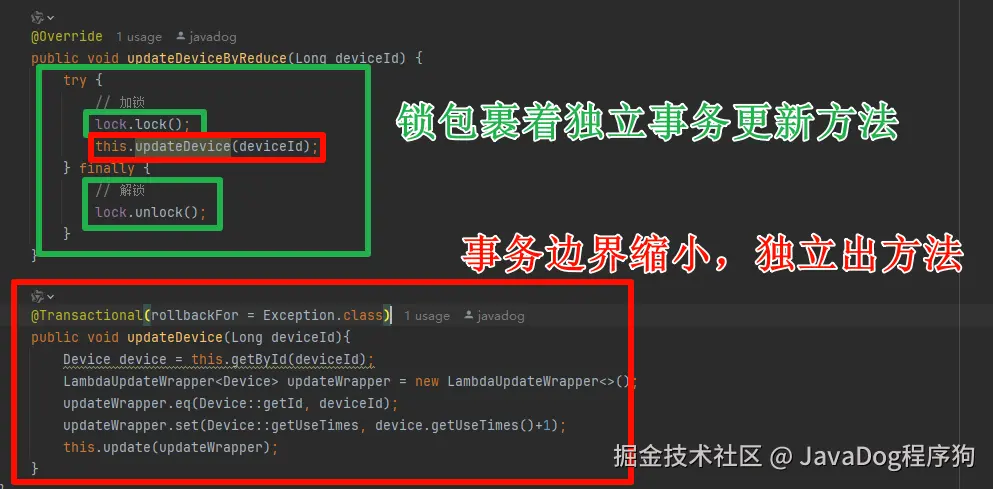 通过上面分析事务套锁失效问题,我们可以采取事务边界缩小,尽量不要让事务边界过大,从而导致包裹着锁导致并发数据问题