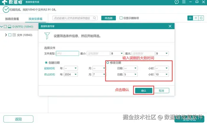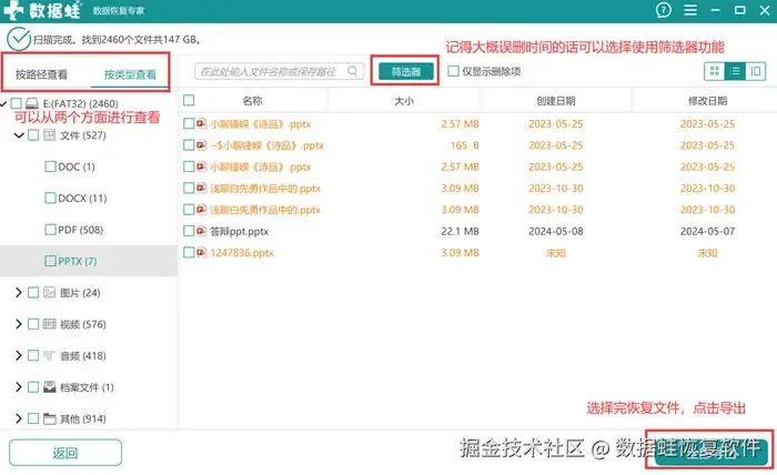 步骤3: 等待软件的扫描工作完成后,就可以查看扫描出来的文件了。在扫描完成的页面左边会有【按路径查看】和【按类型查看】进行分类,你可以选择你更偏好的方式去寻找文件。如果是已经明确误删时间的情况,可以使用【筛选器】功能。选好需要恢复的文件后,就可以点击右下角的【导出】了。