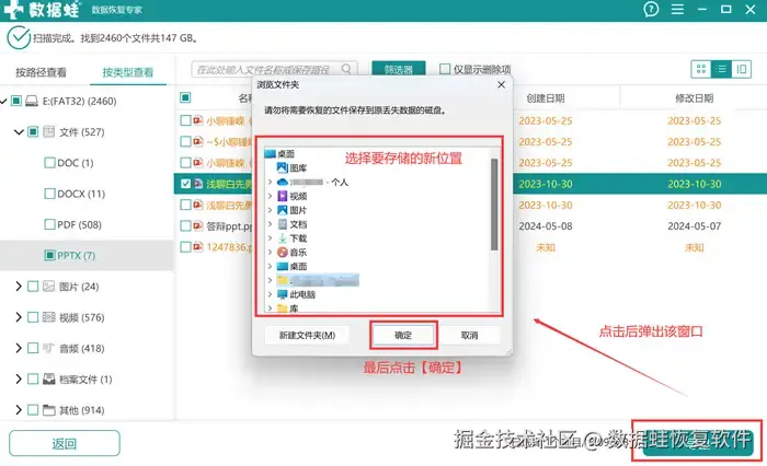 步骤4: 点击【导出】后,选择恢复文件的存储位置,请勿将恢复好的文件放置到丢失的原位置上,其他位置都可以按照你的个人习惯去存储。点击【确定】后,丢失的文件就恢复到刚刚选好的位置上了。