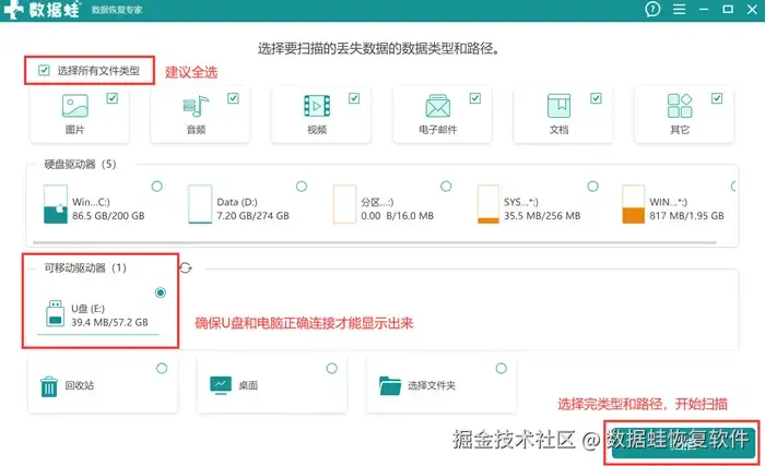 步骤2: 完成下载安装后,先确保U盘已经能够被电脑正确识别。然后再打开软件,在主页面的【可移动驱动器】点击U盘,表明要扫描的路径是该U盘。如果没有明确要选择复原什么类型的文件,可以直接勾选最上方的选择所有文件类型。完成以上操作后,可以直接点击右下角的【扫描】,操作软件开始扫描工作。