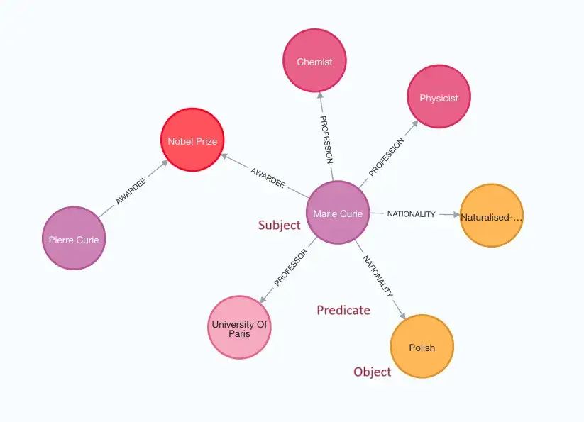 我们可以将知识图谱视为带了主语、谓语和宾语的三元组。它们将信息表示为一个由相互连接的实体组成的网络,以及实体之间的关系。本质上,知识图谱利用基于图的数据模型,其中节点代表实体(如人、地点或概念的主体和宾语),边表示这些实体之间的关系或谓语。