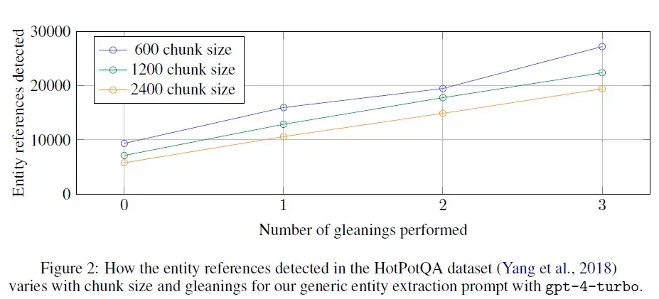 论文中还提到了一个非常有趣的结论,文本块的大小至关重要。例如,使用 600 个 token 比使用 2400 个 token 可以获得更多的提取实体(见上图)。但这需要做一些平衡,因为文本块太小可能会导致上下文信息丢失。