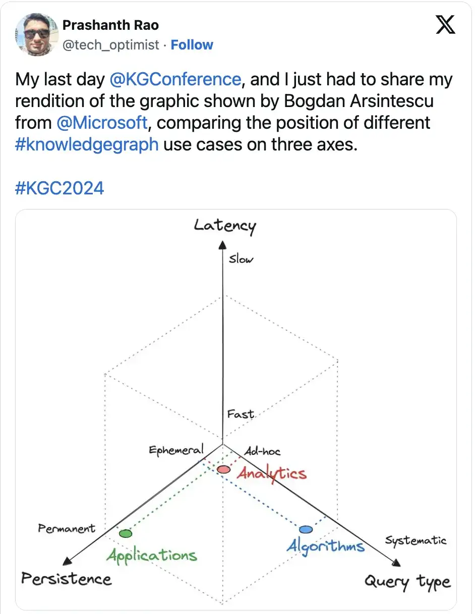 **我们可以通过延时、持久性和查询类型这三个维度的框架,去理解知识图谱在各种应用场景中的多样化。**在分析方面,知识图谱在处理即时查询和系统性分析方面表现出色,从实时的客户洞察到复杂的财务建模都能实现。