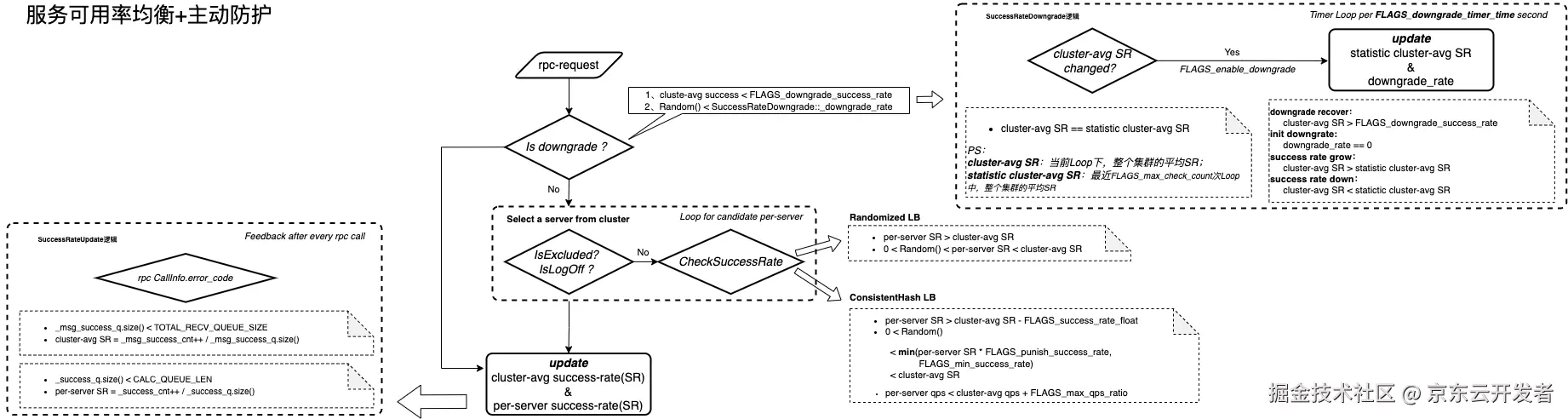•*Stage-3: *主动防护,周期性统计集群历史平均成功率,并判断其变化趋势:如成功率变差,则触发主动防护降级;如成功率变好,则逐渐恢复降级防护。