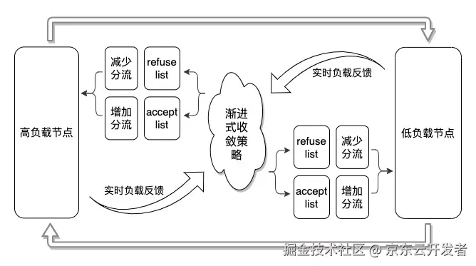 该策略以服务可以率目标为兜底,基于待优化资源利用率目标的期望取值,将任意时刻整个集群的所有节点划分为 “负反馈列表(refuse list) ” 和 “正反馈列表(accept list) ” 两部分,且节点实际取值与期望取值之间的数值差异表征了当前节点在该优化目标上的“均衡度”。同时,负反馈列表中的节点采用减少分流比例策略,正反馈列表中的节点则增加分流比例,而分流策略的具体变化比例由当前节点的均衡度来决定。