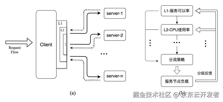 ◦服务可用率指标直接控制节点流量分配、请求降级/恢复:(1)可用率低于集群平均可用率阈值节点减少分流比例;(2)集群平均可用率低于阈值,开启降级防护,并周期性尝试降级恢复。