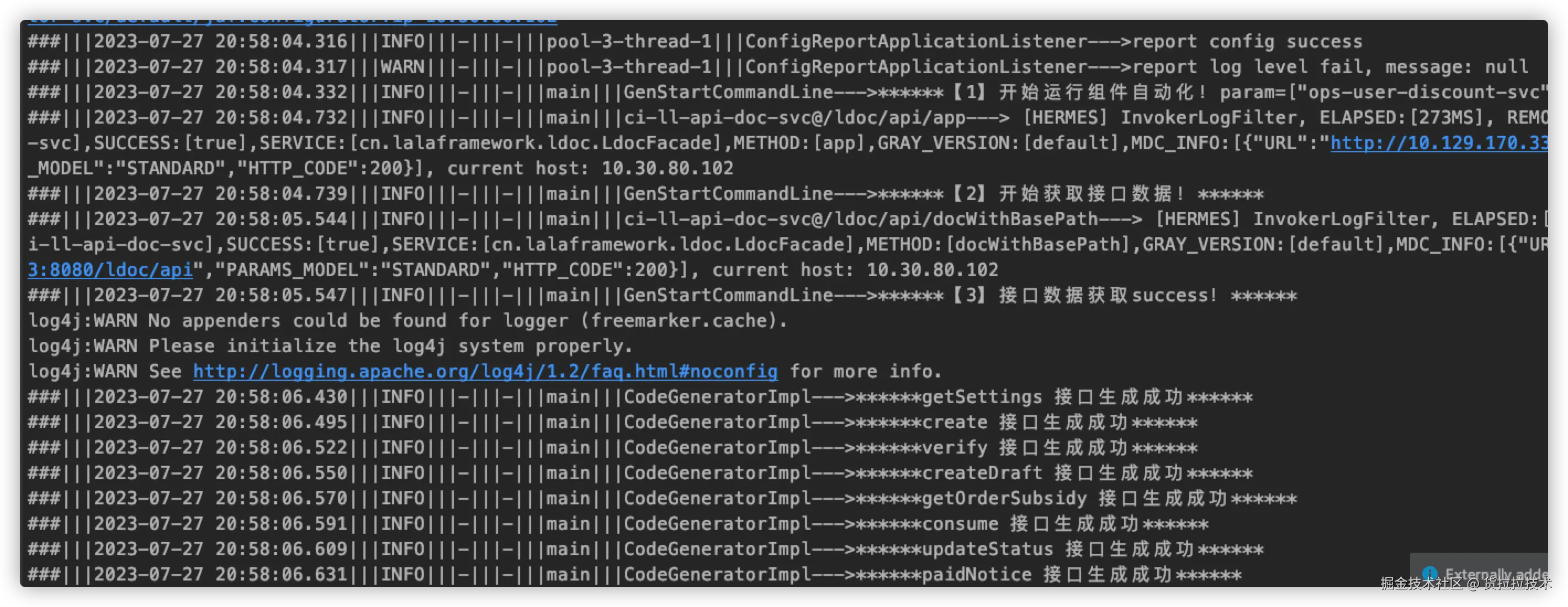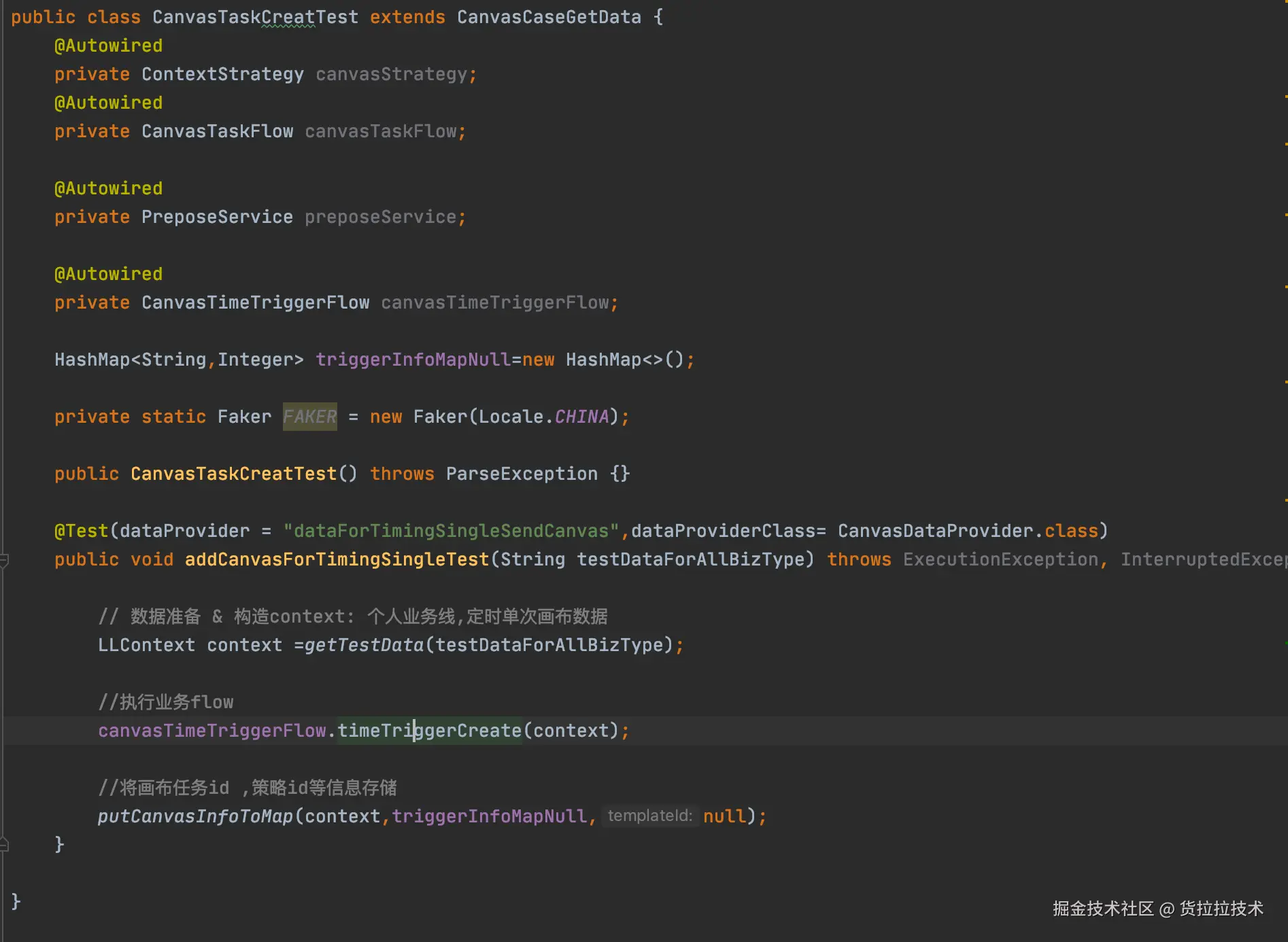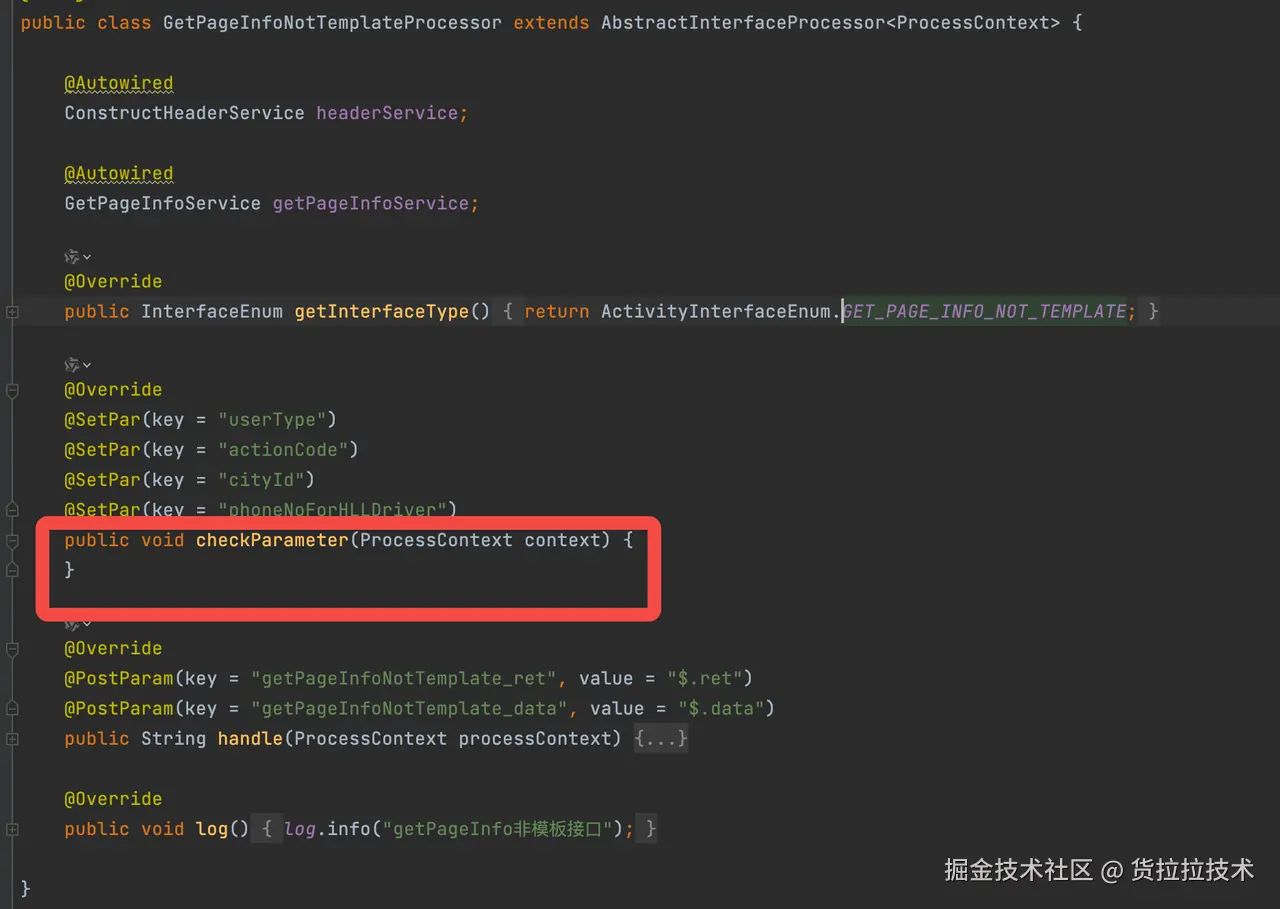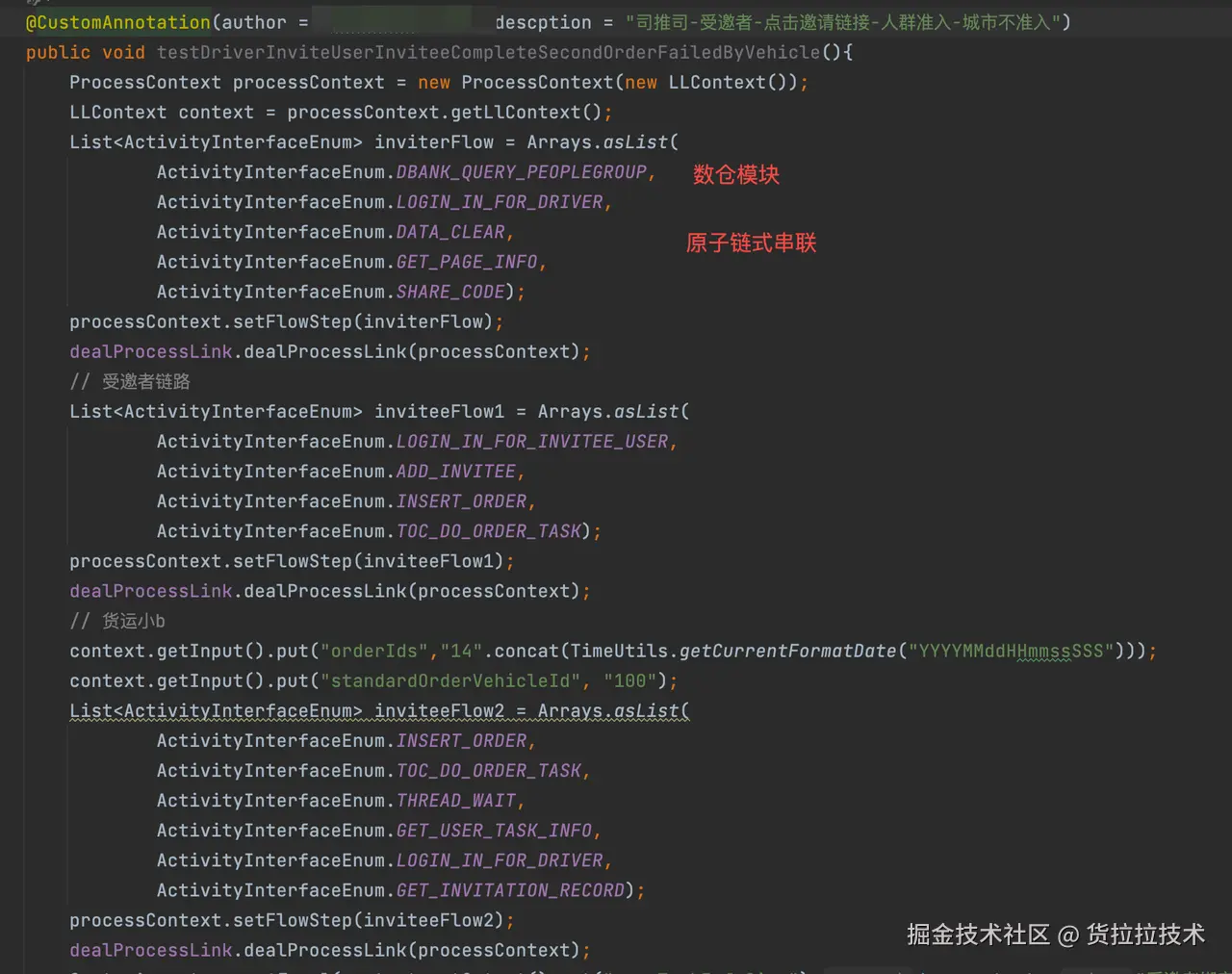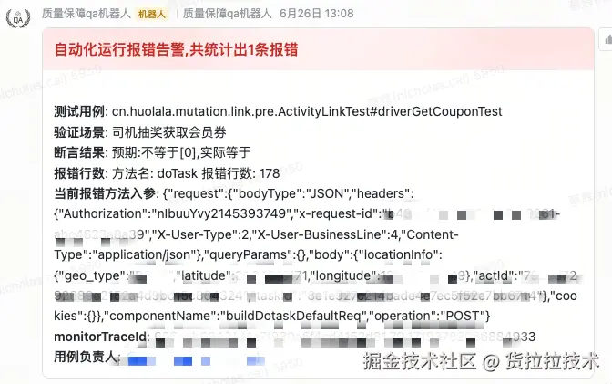 private static String getSendMessage(LLContext context) { String messageInfo = ""; try { String parentMethodName; //这里不知道断言会加在哪里,可能在component,也可能在flow层,向外循环,直到发现有命名是*test*的方法 int count = 0; do { ++count; parentMethodName = Thread.currentThread().getStackTrace()[2 + count].getMethodName(); //忽略大小写 } while (!parentMethodName.toLowerCase().contains("test")); //可能是在lamb表达式里断言 if (parentMethodName.contains("$")) { parentMethodName = parentMethodName.replace("lambda$", ""); parentMethodName = parentMethodName.substring(0, parentMethodName.length() - 2); } String parentClassName = Thread.currentThread().getStackTrace()[2 + count].getClassName(); Method method = null; try { method = Class.forName(parentClassName).getDeclaredMethod(parentMethodName, null); } catch (NoSuchMethodException noSuchMethodException) { //有些人使用dataProvider的写法,test方法是有参数的 Method[] methods = Class.forName(parentClassName).getDeclaredMethods(); if (Objects.nonNull(methods) && methods.length > 0) { for (Method withParaMethod : methods) { if (withParaMethod.getName().equalsIgnoreCase(parentMethodName)) { method = withParaMethod; } } } } method.setAccessible(true); String desc = ""; String reMark = ""; String testCaseAuthor = ""; String currentErrorLine = getCurrentLine(3); if (method.isAnnotationPresent(CustomAnnotation.class)) { desc = method.getAnnotation(CustomAnnotation.class).descption(); reMark = method.getDeclaredAnnotation(CustomAnnotation.class).remark(); testCaseAuthor = method.getDeclaredAnnotation(CustomAnnotation.class).author(); } String testMethodName = method.getName(); String currentParameter = ""; String monitorTraceId = ""; if (Objects.nonNull(context)) { currentParameter = (String) context.getOutput().get("currentParameter"); monitorTraceId = (String) Optional.ofNullable(context.getOutput().get("x-hll-trace")).orElse(""); } String groupName = systemConfiguration.getGroupName(); if (StringUtils.isBlank(groupName)) { groupName = DEFAULT_GROUP_NAME; } //其他字段从yml文件读取,根据不同的群组展示发送不同的字段 Map<String, Map<String, String>> ymlGroupAndFields = (Map) getValueForKey("fields", NEED_TOAST_FIELD); //key-当前组名,values-当前组名需要展示的字段 {自动化告警={traceId=traceId, userId=userId, inviterId=邀请者id, inviteeId=被邀者id, actId=活动id, taskId=任务id}} Map<String, Map<String, String>> currentGroupAndFields = Maps.newHashMap(); if (CollectionUtil.isEmpty(ymlGroupAndFields) || StringUtils.isEmpty(groupName)) { log.warn("ymlGroupAndFields or groupName is null, please check toast_filed.yml and qa-ci config!"); return messageInfo; } String finalGroupName = groupName; ymlGroupAndFields.forEach( (ymlGroupName, ymlField) -> { if (ymlGroupName.equals(finalGroupName)) { currentGroupAndFields.put(ymlGroupName, ymlField); } }); //存的是需要展示的字段-展示字段的值 Map<String, String> fieldAndValue2 = Maps.newHashMap(); //@是作为字段的分隔符 String preStr = String.format("%s@%s@%s@%s@%s@%s@%s@%s@", parentClassName, testMethodName, desc, reMark, currentParameter, testCaseAuthor, currentErrorLine, monitorTraceId); StringBuilder stringBuilder = new StringBuilder(); if (CollectionUtil.isNotEmpty(fieldAndValue2)) { fieldAndValue2.forEach( (key, value) -> stringBuilder.append(value).append("@")); } messageInfo = preStr.concat(stringBuilder.toString()); if (Objects.nonNull(context)) { AssertCommonMethod.currentContextMap.put(parentClassName.concat(".").concat(testMethodName), context); AssertCommonMethod.currentContextMap.put(groupName.concat("_filed_value"), fieldAndValue2); } } catch (ClassNotFoundException | ArrayIndexOutOfBoundsException | NullPointerException e) { // messageInfo = String.format("断言异常:%s", e.getMessage());//这里不能抛异常 messageInfo = String.format("未获取到测试方法,请检查测试方法是否包含test字样@@@@@@@@@@"); } return messageInfo; } ``` -