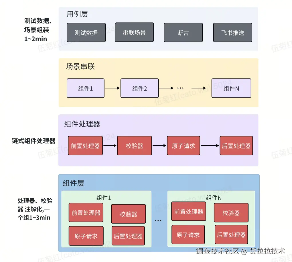 废弃flow层硬编码组装场景的模式,在case层直接串联组件,每个组件包含前置处理器、校验器、原子请求以及后置处理器,case层只需要按照自己需要验证的场景,灵活去组装组件.
