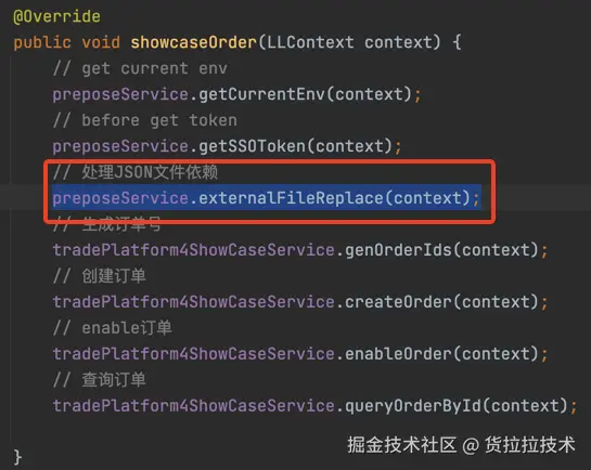 @Override public void showcaseOrder(LLContext context) { // get current env preposeService.getCurrentEnv(context); // before get token preposeService.getSSOToken(context); // 处理JSON文件依赖 preposeService.externalFileReplace(context); // 生成订单号 tradePlatform4ShowCaseService.genOrderIds(context); // 创建订单 tradePlatform4ShowCaseService.createOrder(context); // enable订单 tradePlatform4ShowCaseService.enableOrder(context); // 查询订单 tradePlatform4ShowCaseService.queryOrderById(context); } ```