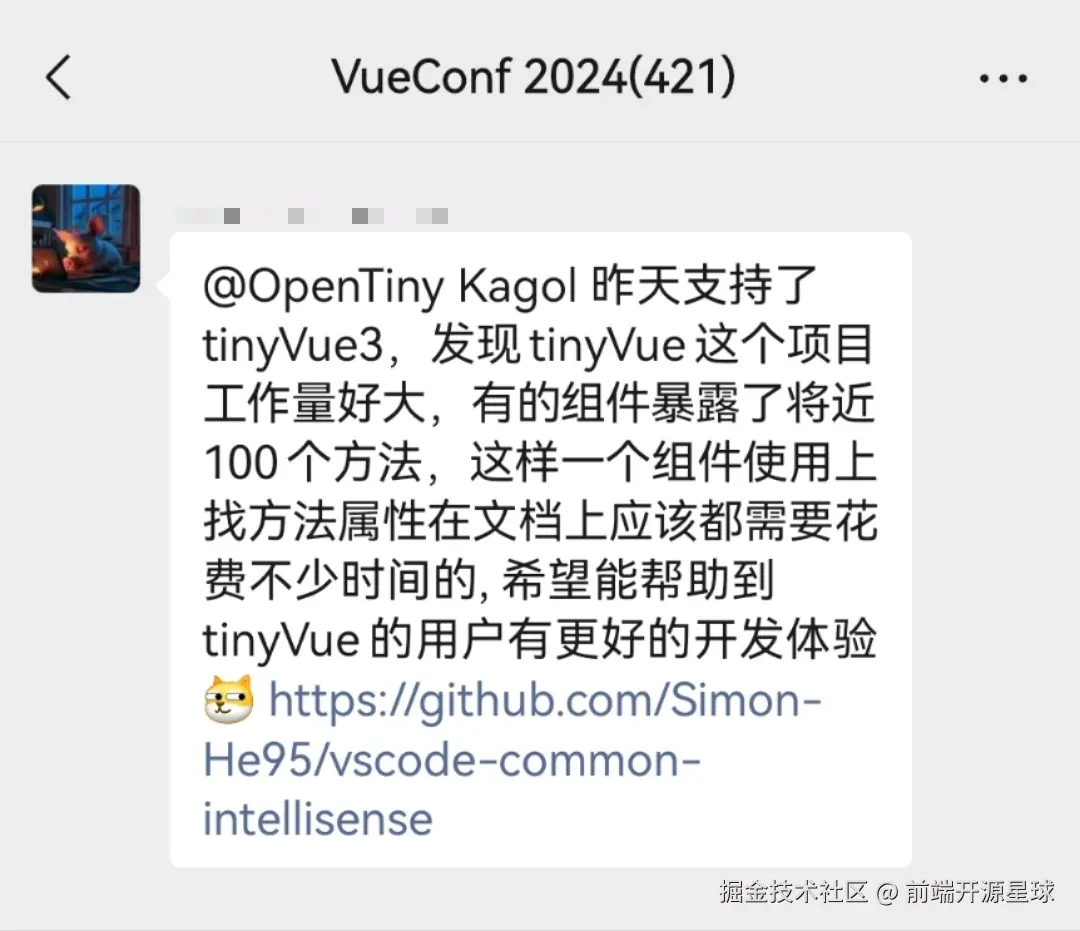 前两天,common-intellisense 开源项目的作者 Simon-He95 在 VueConf 2024 群里发了一个重磅消息: