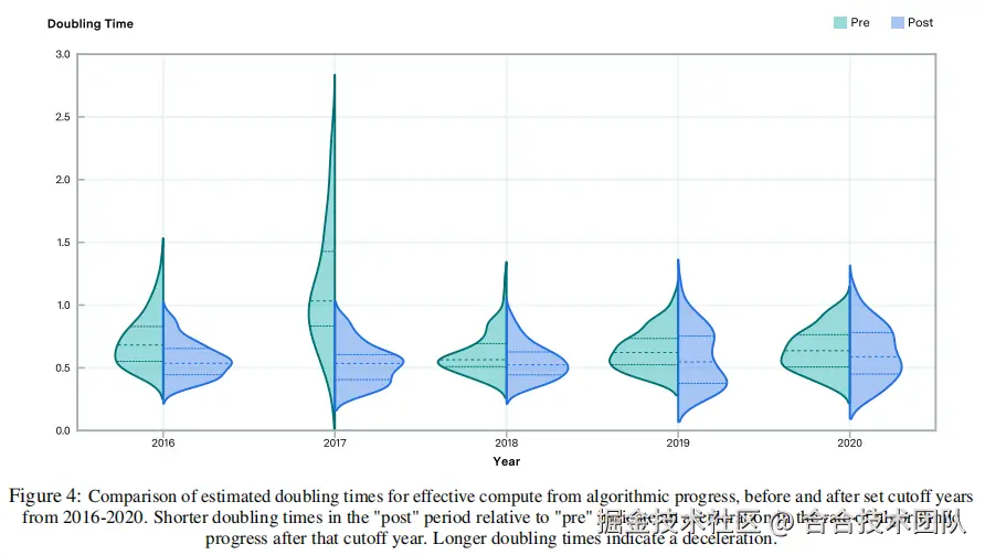 通过观察来自不同模型的预测,论文进一步检验了这个结果的稳健性。特别是,因为论文使用留一交叉验证来执行模型选择,所以论文可以将论文的首选模型的预测与论文所考虑的其他模型的预测进行比较。根据论文的交叉验证练习,连接前10个模型的倍增时间估计数,论文发现中位倍增时间为7.8个月[95%CI:1.5-17.6个月],这与论文所首选的模型相似。 另一种方法依赖于计算方案,而不是倍增时间的封闭解。论文首先计算通过加倍计算预算来实现的损失∆L的减少,假设N和D在估计的模型下是最优的。然后,论文确定了算法改进所需的时间,以产生等效的损失∆L减少。结果表明,这些方法产生的结果几乎相同,中位数的倍增时间为8.6个月,95%的置信区间为4.5-14.5个月。本程序在附录G中有更详细的说明。 该估计在计算机视觉算法进展率(Erdil和Besiroglu 2022)、强化学习的样本效率改进(Dorner 2021)以及特定输入大小下常见算法家族的估计速率的置信区间范围内。总的来说,论文的研究结果表明,语言模型的算法进展与之前研究的领域中算法和软件的进展速度相当,而且可能更快(见图1)。 虽然论文的模型的结构不适合分析算法改进速度上的细粒度加速或减速,但论文仍然可以测试增长率在整个时间段内一次性增加或减少的可能性。为此,论文考虑了论文的首选模型(模型7)的一个变体,其中引入了一个虚拟变量——对于在某一年开始之前发布的任何模型,这都等于0,否则为1。这允许论文考虑在某一年的截止时间前后倍增时间(例如2017年),论文对几个这样的截止时间进行分析。 其结果如图4所示。在这里,论文可以看到,2017年初前后估计的倍增时间的差异非常明显,但截止年份的其他选择并非如此。在每一年,截止年开始后,中位数的倍增时间都要快,但通常只是略快。总的来说,这并没有提供算法进步的急剧加速的有力证据。这并不排除效应量较弱的可能性,因为论文的方法在统计上的动力不足。