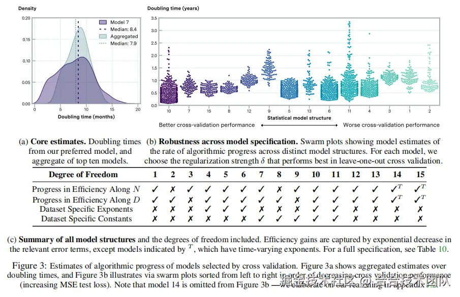 在某些情况下,从同一篇论文中检索到多个模型,即使它们构成了类似的算法创新。这可能会给自相关带来问题,这可能导致低估论文单个参数估计的不确定性。因此,在接下来的主要分析中,每篇论文最多只包含三个模型,这导致大约50个模型被排除。为了验证这种方法的稳健性,论文还考虑了另一种技术,直接解释自相关,它产生与论文的主要结果一致的加倍时间和置信区间估计(见附录I)。