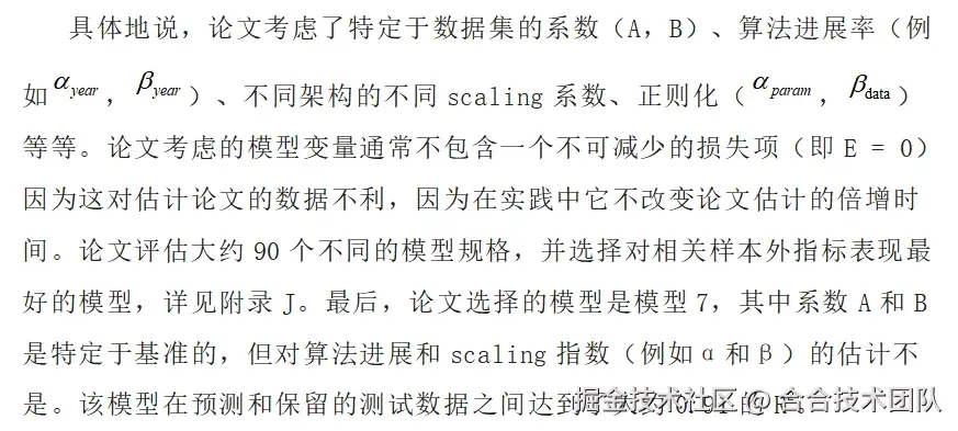 依赖于Chinchilla scaling law。论文的模型推导出的scaling law适用于遵循GPT-3架构的密集transformer。论文使用这个scaling law来建模不同transformer架构、递归神经网络等的算法改进。未来的算法也可能遵循不同的scaling law。然而,论文相信论文的核心结果很可能仍然成立:首先,神经scaling并不是一种局限于transformer的现象。论文发现广泛的统计模型结构提供一致的估计,和替代方法估计预训练算法进展也给类似的结果(见附录),所以很可能论文的核心结果是鲁棒的。