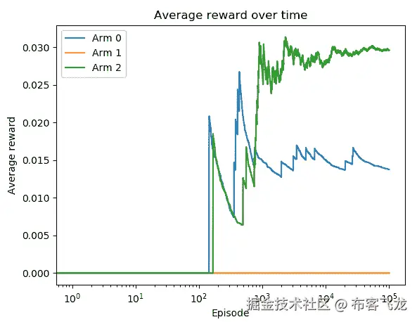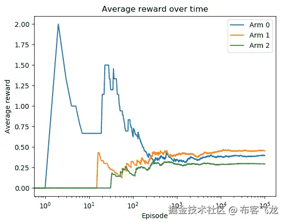 臂 1 是平均奖励最高的最佳臂。此外,平均奖励在大约 10,000 个 episode 后开始饱和。